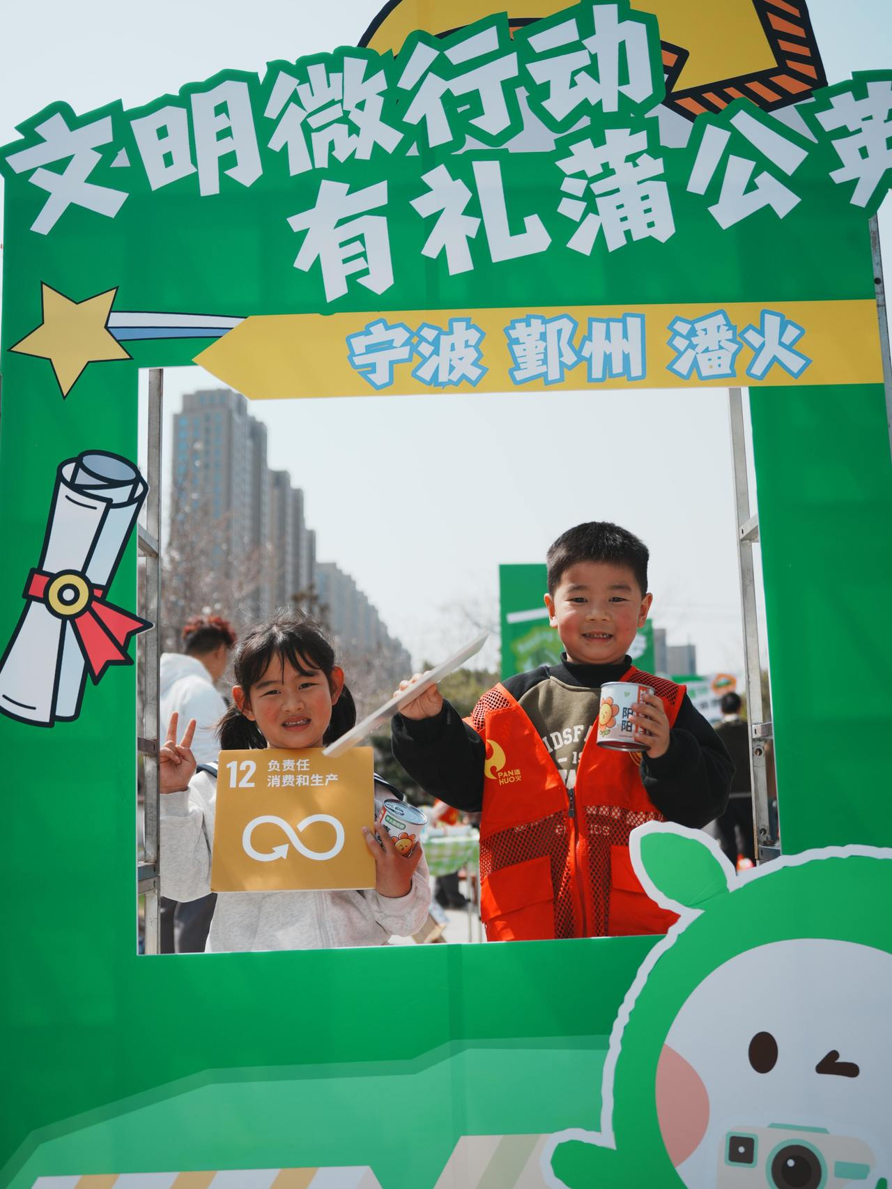 东杰幼儿园儿童参与“环保艺术品”创作,轨道交通捍海服务队引导居民以旧报纸寄语低碳,东南社区设立“一瓶有礼”兑换点,以低门槛机制推动居民践行零废弃生活。